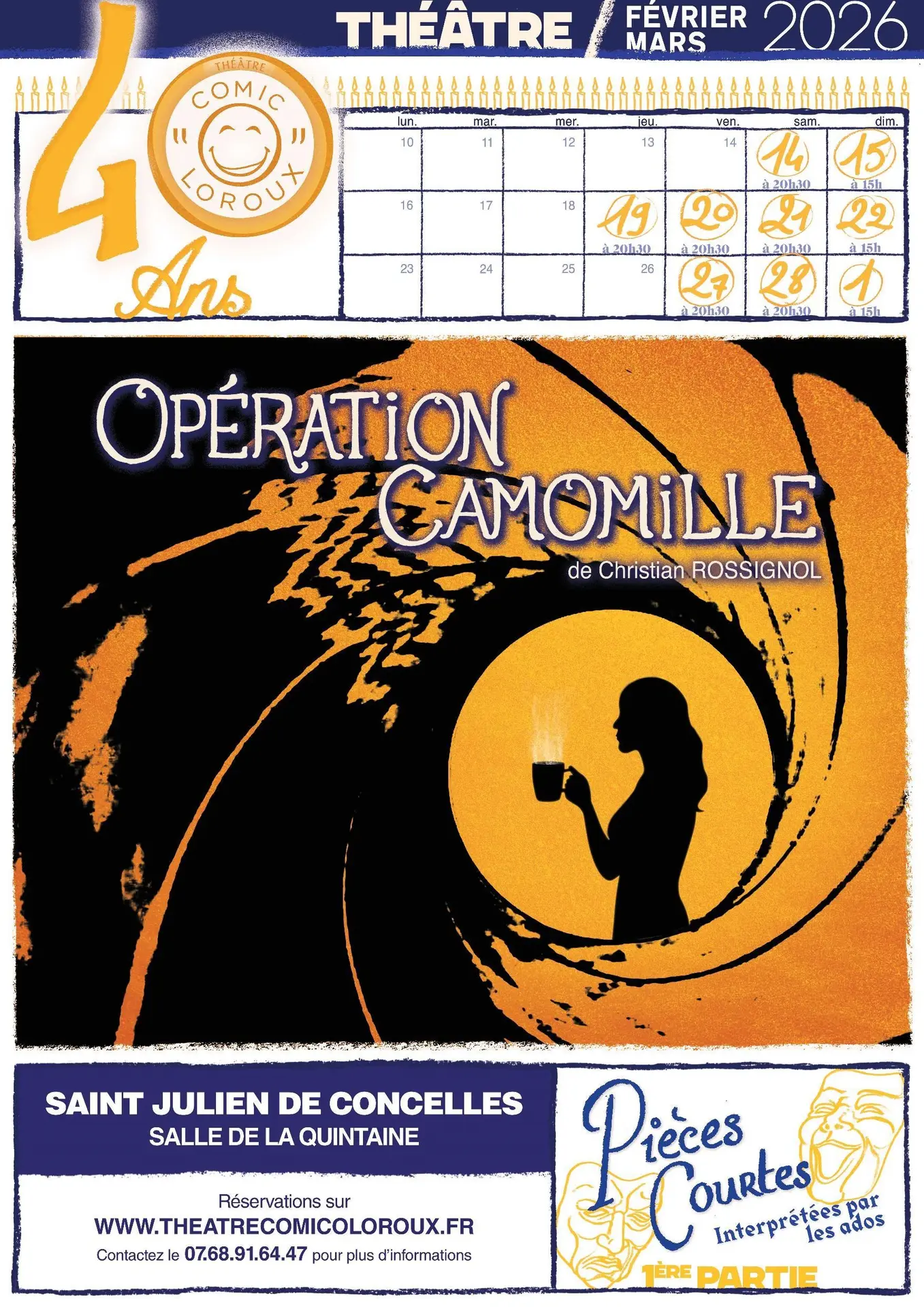 Réservations via le site internet www.theatrecomicoloroux.fr ou aux dates de permanence du 2 février 2026.