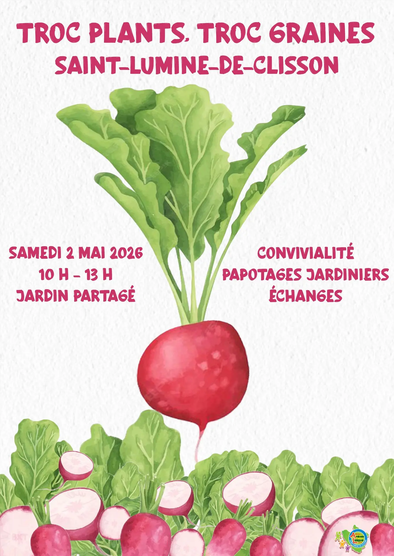 La section Jardin Partagé de l’Amicale Laïque de Saint-Lumine-de-Clisson a le plaisir de vous convier à la 11e édition de son Troc Plants & Graines le samedi 2 mai 2026 de 10 h à 13 h.