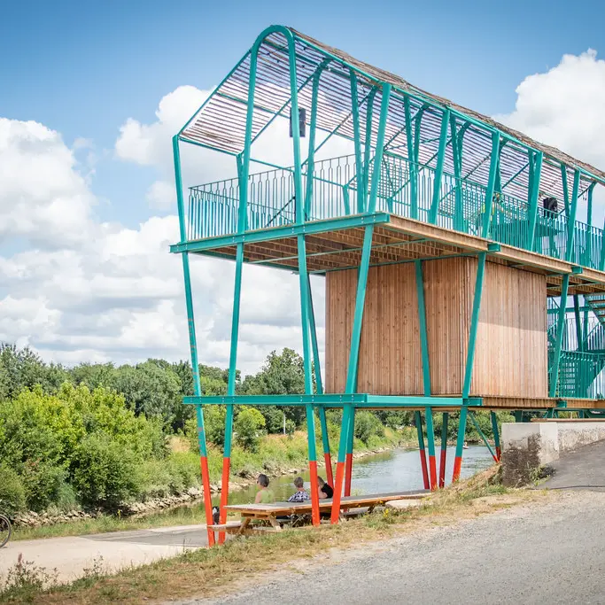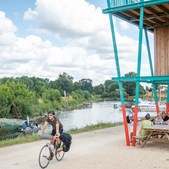 La halte vélo de la Pierre Percée, aire d'arrêt principale de la Loire à vélo, sublimée par un belvédère surplombant la Loire offre tous les services utiles aux cyclotouristes et touristes en balade sur les bords de Loire.