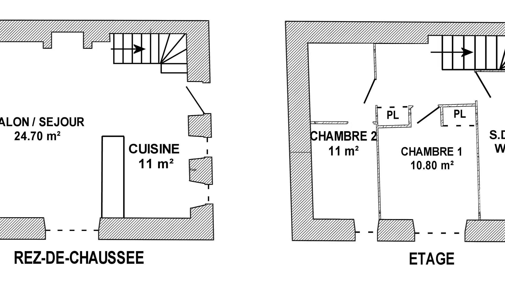 Etage : 2 chambres (1: lit 160x200, 2: 2 lits 90x190) et salle d'eau/wc.
