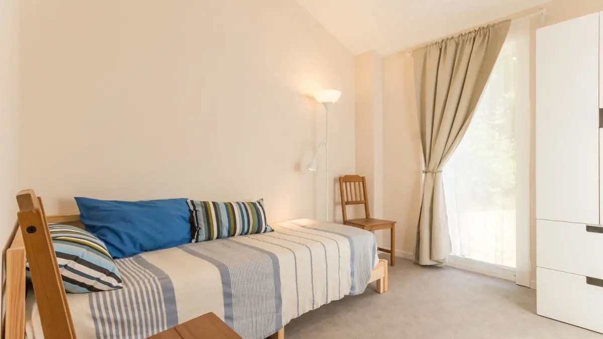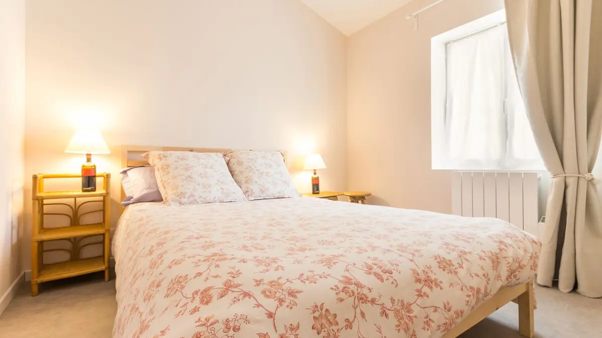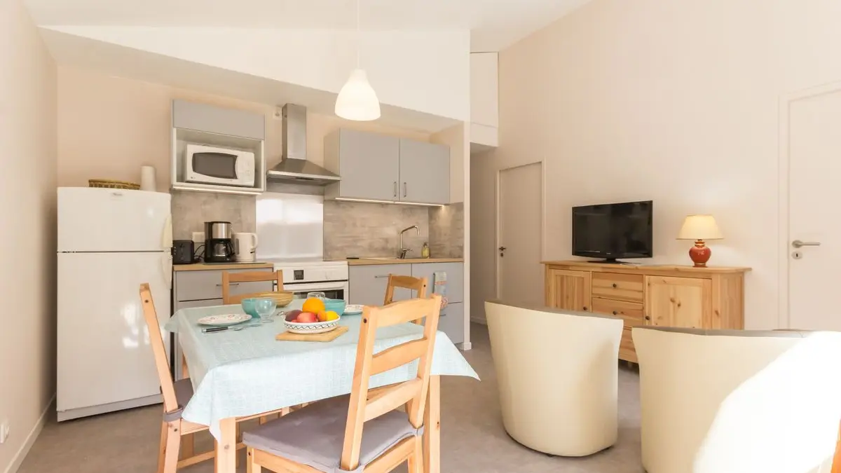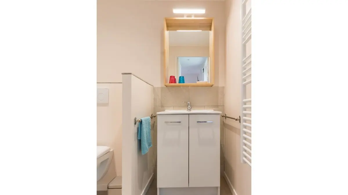 Lumineuse et entièrement rénovée, elle se compose d'un salon/séjour avec cuisine équipée, d'une salle d'eau avec WC et de 2 chambres (1: lit 140x200, 2: 2 lits 80x200 jumelables mais non séparables).