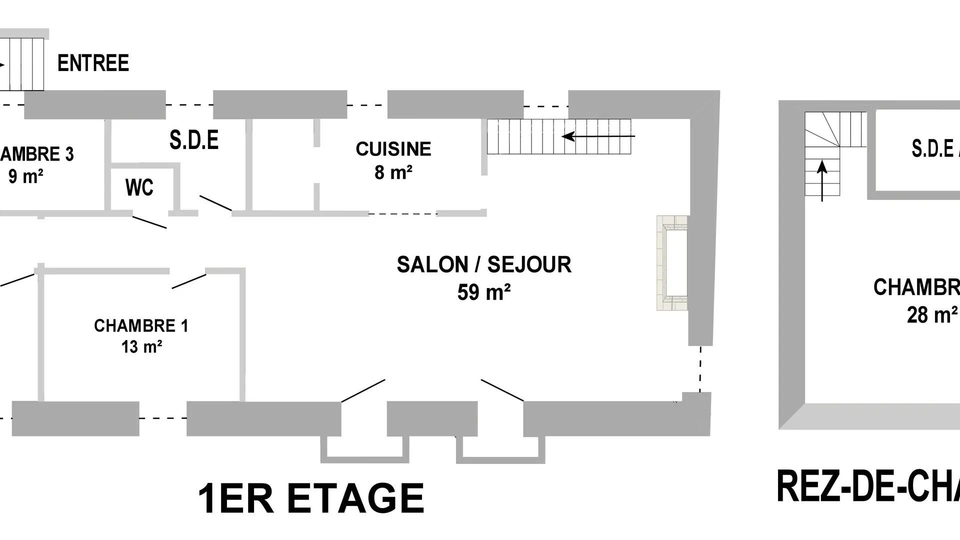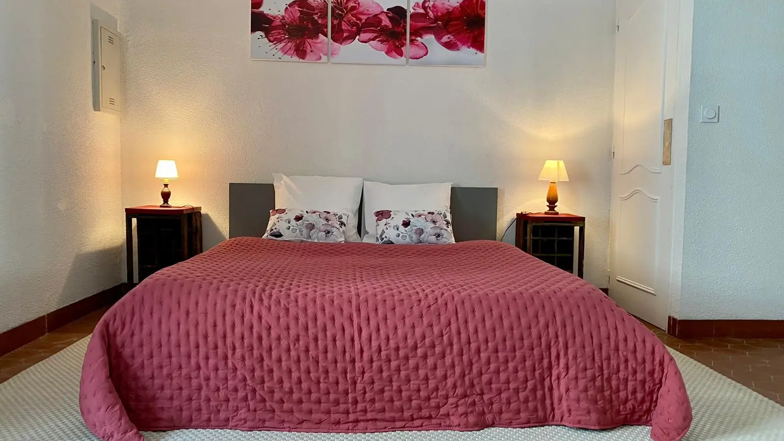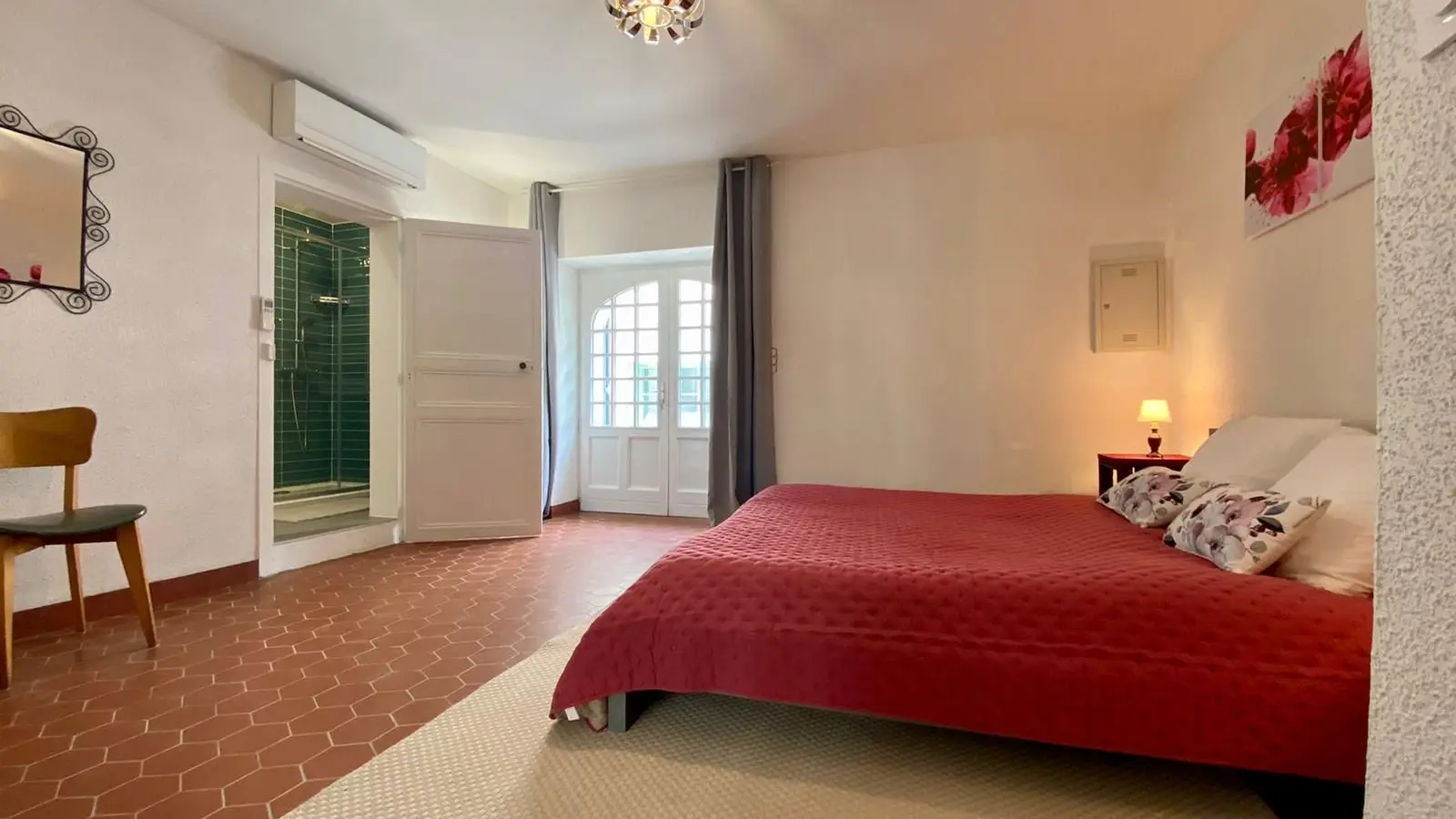 RDC: 1 chambre (lit 160x200) avec salle d'eau/wc privatifs (accès indépendant possible par l'extérieur).